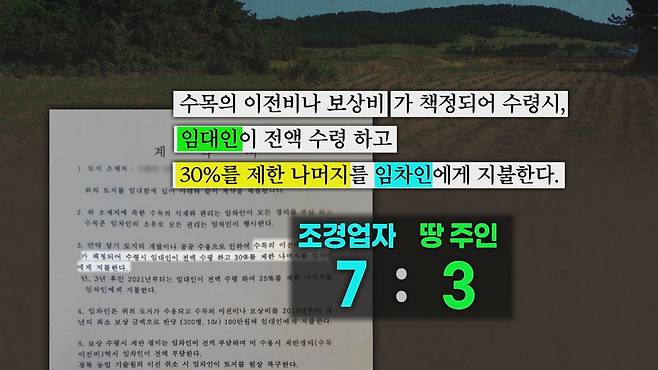 ②나무 보상비를 받게 되면 조경업자가 7을, 땅 주인이 3을 갖는다.