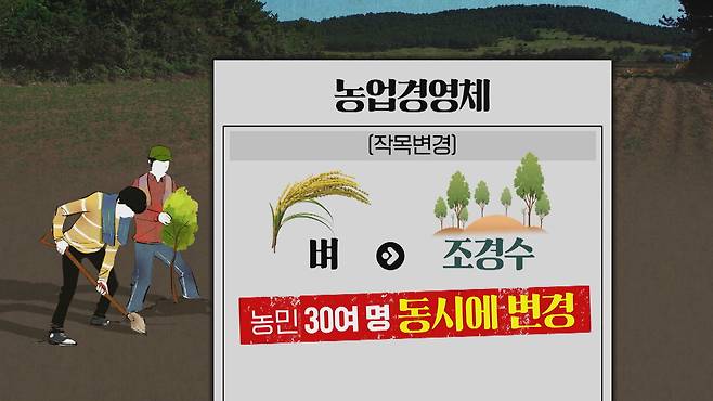 계약서를 쓴 시점 이듬해, 농민 30명이 동시에 농업경영체 상 작목을 벼에서 조경수로 변경한 것이다.