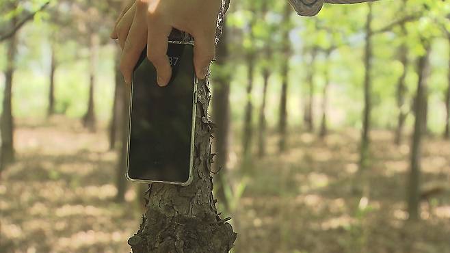 소나무인데 둘레가 너무 얇아서 휴대폰 너비와 같은 정도다.