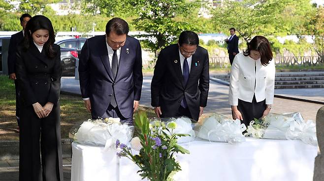 윤 대통령과 김건희 여사, 기시다 총리와 유코 여사는 오늘 오전 7시 35분쯤 위령비를 찾아 일렬로 서서 백합 꽃다발을 헌화하고 허리를 숙여 약 10초간 묵념하며 한국인 원폭 희생자를 추도했습니다.
