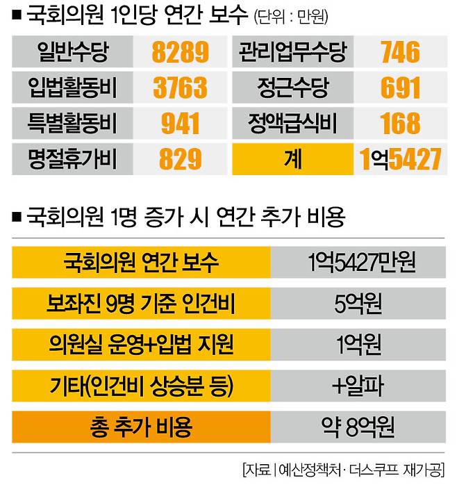 우리나라 국회의원들이 정치는 이렇게 하면서도 나라에서 받는 세비는 주요국들보다 많다. 국회의원들이 1년 동안 받는 세비는 1억5427만원(2022년 기준). 300석 의석을 곱하면 연간 463억원이 급여로 지급된다. 의원들은 9명(인턴 1명 포함)의 보좌직원을 둘 수 있고, 이들이 받는 급여총액이 약 5억원이다. 의원 1명의 의정활동을 위해 지급되는 국민 세금이 7억5600만원인데, 그만한 일은 하는가.