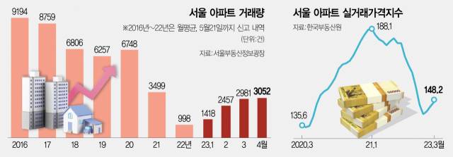서울 아파트 거래가 정상거래 수준으로 되돌아가기에는 아직 상당한 시일이 소요될 것이라는 전망이 나온다. 서울 아파트 거래는 2016년 월평균 9194까지 늘었다가 2017년 8759으로 내린 후 2018년~2020년에는 6000건을 기록했었다. 아파트 가격이 급등한 2021년 3499건으로 줄었다가 2022년 998년으로 1000건을 밑돌았다. 윤지해 부동산R114 리서치팀 수석연구원은 "서울의 경우 수요자 입장에서 여전히 가격에 대한 부담감이 있기 때문에 거래가 폭발적으로 늘어나는 데는 한계가 있다"고 말했다. 특히 대량의 거래가 수반되지 않으면 가격의 대세상승 역시 힘들다는 게 전문가들의 평가다.