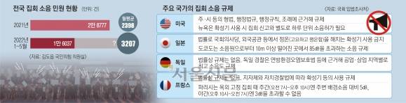 실제 집회·시위 과정에서 제기되는 소음 관련 민원은 늘어나는 추세다. 경찰청이 지난해 김도읍 국민의힘 의원실에 제출한 자료를 보면 2021년 집회 소음 관련 112 신고 건수는 월평균 2398건(연간 2만 8777건)이었지만, 지난해에는 3207건(1~5월 1만 6037건)으로 집계됐다.