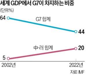 이번 회담에는 ‘G8’의 유력 후보인 한국을 비롯해 호주, 인도, 각 지역 연합 의장국 등 8개국이 초청됐다. 국제 정치 전문가들은 “국제 질서를 주도할 힘을 잃어가는 G7이 넥스트 G7 국가에 구원을 요청한 것”으로 해석했다. 세계 국내총생산(GDP)에서 G7이 차지하는 비중은 2002년 64%에서 2022년 44%로 급감했다. 그사이 중국과 러시아의 비중은 5%에서 20%로 늘었다.
