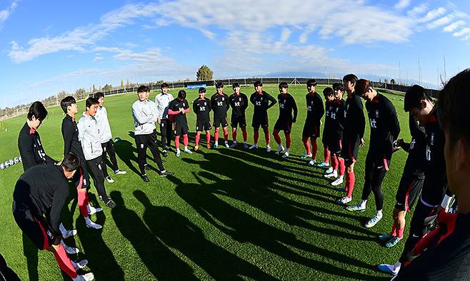 김은중 U-20 축구대표팀 감독(왼쪽 여섯번째)이 지난 20일 아르헨티나 멘도사 클럽 데포르티보 고도이 크루즈 트레이닝센터에서 선수들과 전술에 대해 이야기하고 있다.