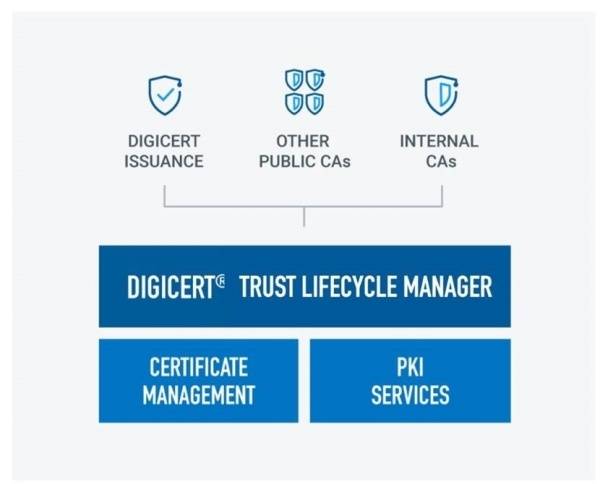 디지서트의 트러스트 라이프사이클 매니저(Trust Lifecycle Manager)는 디지서트 공개 신뢰(public trust) 발급 기능에 CA(인증 기관)에 제약 없는 인증서 관리와 공개키 기반 구조(PKI) 서비스를 하나로 통합한 솔루션으로, 기업 인증서 환경에 대한 중앙화된 가시성과 제어 기능을 제공하고, 기업 디지털 신뢰 인프라를 빈틈없이 관리할 수 있도록 지원한다.