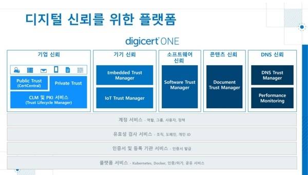 디지털 신뢰 강화를 위한 플랫폼인 디지서트 ONE은 웹사이트, 기업 접근이나 커뮤니케이션, 소프트웨어, 신원확인, 콘텐츠와 디바이스에 대한 보호를 수행하며 조직에게 광범위한 공공, 민간의 신뢰 수요에 대한 중앙화된 가시성과 제어 기능을 제공한다.