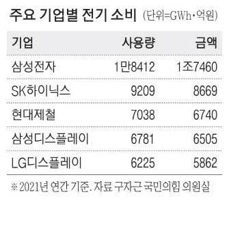 구자근 국민의힘 의원실에 따르면, 전력 소비 상위 30개 기업이 한 해 동안 사용한 전기량은 10만2924GWh(2021년 기준)로 집계됐다. 이에 따른 전기요금은 9조8055억원에 달했다.