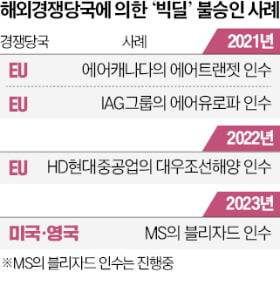 자국 우선주의가 확산되면서 해외 경쟁당국에 의한 기간산업 M&A 불발 사례가 속출하고 있다. 2021년 캐나다 1위 항공사인 에어캐나다가 에어트랜젯 인수를 추진했지만 EU 경쟁당국의 문턱을 넘지 못한 게 대표적이다.