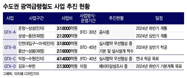내년 상·하반기 부분 개통 예정인 A노선(운정역~동탄역)은 재정+민자(BTO) 혼합 방식으로 진행 중이다. 민간 운영기간은 30년이다. 파주 운정역~삼성역(민자구간)은 2024년 하반기, 삼성역~동탄역(재정구간)은 2024년 상반기 개통이 목표다. 4월 말 기준 재정구간 공정률은 70%, 민자구간은 60%선으로 추정된다. 다만 A노선은 부분개통 이후에도 서울시 삼성역복합환승센터 계획에 따라 삼성역 구간을 잇는 완전 개통까지는 4년가량 더 소요될 전망이다. 부분 개통에 따라 발생하는 손실액은 연간 600억원으로 추산된다. 손실분은 국토부 예산으로 충당할 예정이다.