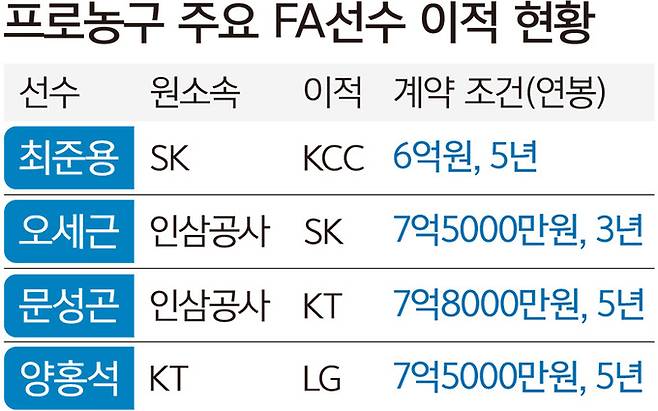 이번 FA 시장은 각 팀의 간판급 선수들이 매물로 나와 큰 주목을 받았다. 그리고 이들 대부분 유니폼을 갈아입어 충격의 연속이었다. 그 시작은 ‘통합 챔피언’ 안양 KGC인삼공사의 우승 주역 중 한 명인 문성곤(30·196㎝)이다. 4시즌 연속 최우수수비상을 수상한 ‘수비왕’ 문성곤은 수원 KT로 이적(계약 기간 5년, 연봉 보수 총액 7억8000만원)하며 연쇄 이동의 신호탄을 쐈다. 문성곤을 잡은 KT는 국가대표 포워드 양홍석(26·195㎝)을 계약 기간 5년, 보수 총액 7억5000만원에 창원 LG로 보냈다. KT는 다음 시즌 군 복무를 마치고 돌아오는 허훈과 함께 문성곤을 주축으로 선두권 경쟁을 펼칠 전망이다.