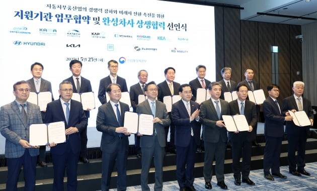 23일 서울 포시즌스호텔에서 열린 '자동차부품산업의 경쟁력 강화와 미래차 전환 촉진을 위한 지원기관 업무협약 및 완성차사 상생협력 선언식'에서 이창양 산업통산부 장관과 협약 참여 기업 대표들이 기념촬영을 하고 있다. 앞줄 왼쪽부터 문재호 코넥 부사장, 류제도 KG모빌리티 상무, 양준규 동양피스톤 사장, 이 장관, 장재훈 현대차 사장, 장국환 삼보모터스 사장, 홍영진 르노코리아 부사장, 이문석 서진캠 사장. 뒷줄 왼쪽부터 박청원 전자진흥회 부회장, 우태희 대한상의 부회장, 강남훈 한국자동차산업협회 회장, 오원석 자동차부품산업진흥재단 이사장, 신달석 한국자동차산업협동조합 이사장, 김학도 중소벤처기업진흥공단 이사장, 유정열 코트라 사장, 임광훈 자동차연구원 부원장.