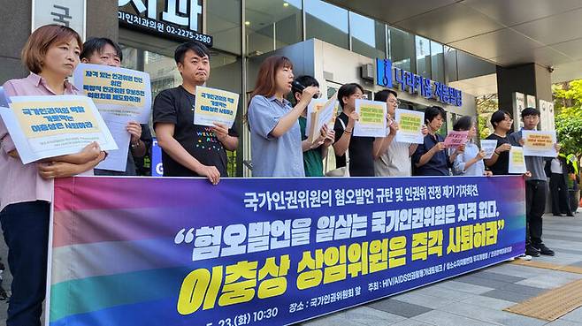 성소수자차별반대 무지개행동 등은 오늘(23일) 오전 서울 중구 인권위 앞에서 기자회견을 열고 "인권위원으로서 기본적 자격이 없는 이 위원은 즉시 사퇴하라"며 "차관급 정무직 상임위원이 계속해서 소수자에 대한 혐오와 차별을 선동하는 것을 방치한다면 이는 인권위의 존재 가치 자체를 흔드는 일이 될 것"이라고 주장했습니다.