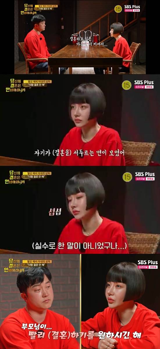 남편이 "결혼을 왜이렇게 빨리 하자는 거냐. 결혼해서 빨리 아기를 갖고 싶은 것도 아니고, 어차피 우리는 같이 살고 있는데 빨리해서 뭘 하고 싶은지가 의문"이라고 하자, 아내는 "부모님이 빨리 (결혼)하기를 원하시긴 해"라고 말했다.
