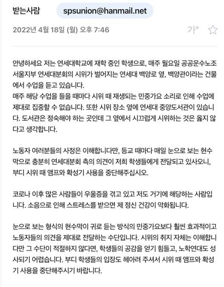 현장 대화에 실패한 이씨는 민노총 공공운수노조 서울지부 대표 이메일 주소로 두 차례 글을 썼다.