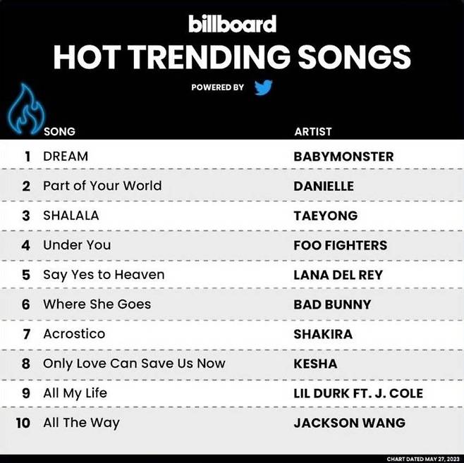 23일(현지시간) 미국 빌보드가 발표한 최신 차트에 따르면 베이비몬스터의 프리 데뷔곡 'DREAM'은 빌보드 '핫 트렌딩 송즈'(Hot Trending Songs) 차트에서 1위를 기록했다.