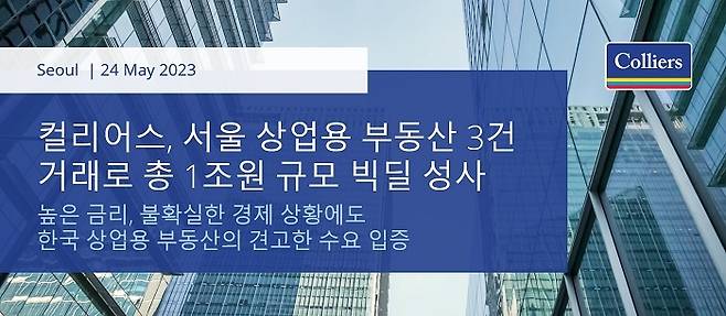 글로벌 부동산 컨설팅 업체 컬리어스 코리아는 2023년 5월 총 3건의 주요 상업용 부동산 거래로 약 1조 원(7억 8천만 달러) 규모의 빅딜을 완료했다고 밝혔다.