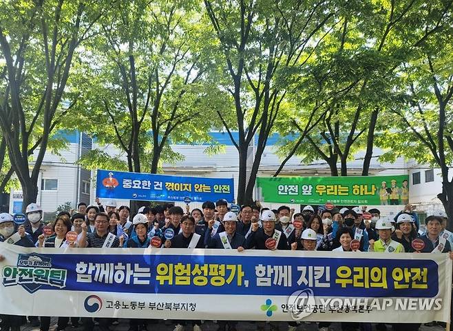 (부산=연합뉴스) 부산북부고용노동지청은 24일 올해 제10차 현장점검의 날을 맞아 최근 제도 개편으로 현장 활용도를 높인 '위험성 평가'를 집중 안내·점검하고, 사업장을 대상으로 관련 캠페인을 벌였다고 밝혔다. 사진은 캠페인을 실시한 부산북부고용노동지청 직원들 모습. 2023.5.24 [부산북부고용노동지청 제공. 재판매 및 DB금지]