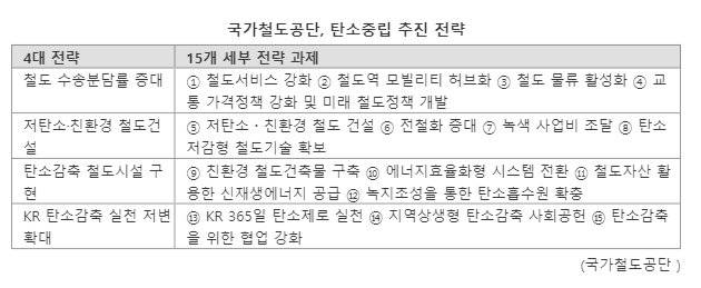 4대 전략은 철도 수송분담률 증대, 저탄소·친환경 철도 건설, 탄소감축 철도시설 구현, KR탄소 감축 실천 저변 확대를 말한다. 앞서 공단은 지난 2022년 7월 철도부문 공공기관 최초로 탄소중립 추진 전략을 마련하기도 했다.
