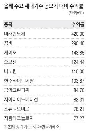 또 새내기주 대부분이 상장 첫날 공모가보다 높은 시초가를 형성하면서 공모 청약에 나섰던 투자자들도 높은 수익을 냈을 것으로 보인다. 지난 1월 코스닥에 상장한 반도체 유통업체 미래반도체, 스튜디오미르 등이 시초가가 공모가의 두 배에 형성된 후 당일 상한가에 마감하는 '따상'을 기록했다.