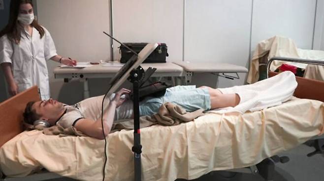 이번 연구에 참여한 남자들은 60일 동안 머리 쪽이 수평보다 6도 아래로 기울어진 침대에 누워 있는 대가로 1만 8천 유로, 우리 돈으로 2천500여만 원을 받습니다.