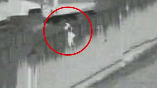 이번에는 장벽에 매달린 사림이 4살 아이를 어깨 너머로 받아 걸칩니다.