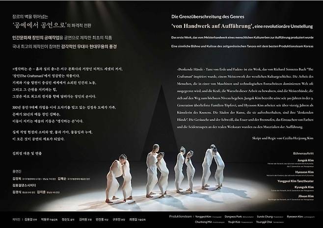 김 연출은 "우리의 전통공예 장인을 직접 출연시켜 '흙'과 '실'이 '도자기'와 '매듭'으로 완성되는 인고의 과정을 '인간문화재 작업무용극'이라는 믹스미디어 형태의 공연으로 연출했다"고 소개했다.