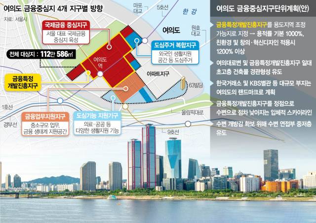 핵심은 금융특정개발진흥지구에 대한 높이 규제 폐지다. 시는 여의도를 △국제금융중심지구 △금융업무지원지구 △도심기능지원지구 △도심주거복합지구로 구분하고 이 중 국제금융중심지구 내에서도 핵심지를 금융특정개발진흥지구로 정해 이 일대에 350m 이상의 초고층 건축물을 유도하기로 했다. 금융특정개발진흥지구는 현재 여의도역 교보증권 빌딩, 여의도 종합상가, 한국거래소 등이 들어서 있는 여의도역 주변부로 시는 이 지역에 350m가 넘는 초고층 건물을 유도해 입체적인 경관을 형성하고 세계적인 수변 도시 경관을 창출할 방침이다.