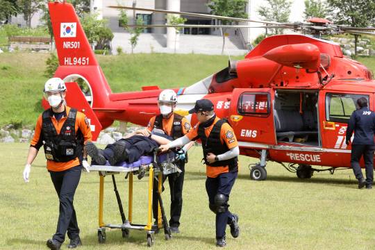 헬기 응급환자 이송 합동훈련이 24일 대전 중구 충남대학교병원 의료재활센터 앞 운동장에서 열려 소방대원들이 환자를 이송하고 있다.