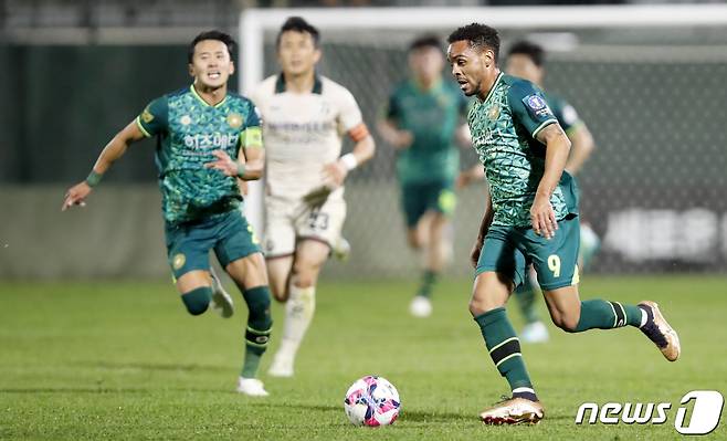 (김포=뉴스1) 김도우 기자 = 24일 오후 경기 김포 솔터축구전용구장에서 열린 2023 하나원큐 FA컵 16강전 김포FC와 강원FC의 경기, 김포FC 주닝요가 공격을 하고 있다. 2023.5.24/뉴스1