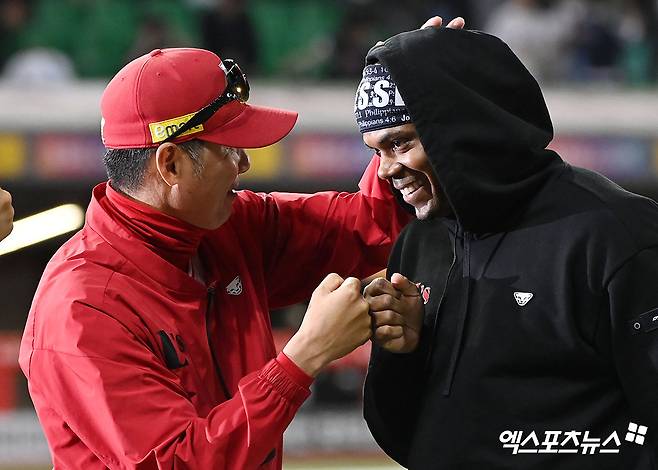 이날 경기에서 승리한 SSG 김원형 감독이 엘리아스와 함께 기뻐하고 있다.
