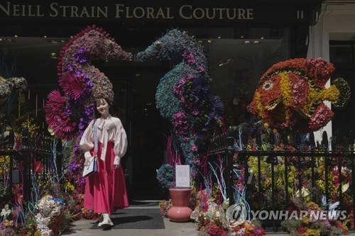A women poses for a photograph besides floral installations depicting seahorses during the "Belgravia in Bloom" floral show in London, Wednesday, May 24, 2023. The floral art show is displayed from May 22 to 29. (AP Photo/Kin Cheung)