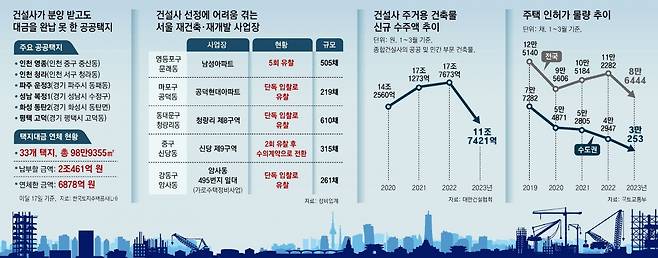 부동산 시장이 장기간 얼어붙으면서 한때 건설사에 높은 수익을 안겨주던 공공택지 개발부터 수도권 재개발·재건축 등 정비 사업까지 위축되고 있다. 향후 주택 공급에 직접적인 영향을 미치는 인허가·착공도 크게 감소하고 있다. 이대로 신규 주택 공급이 줄어들면 이르면 3년 뒤 집값 불안 요인이 될 수 있다는 우려가 나온다.