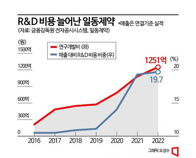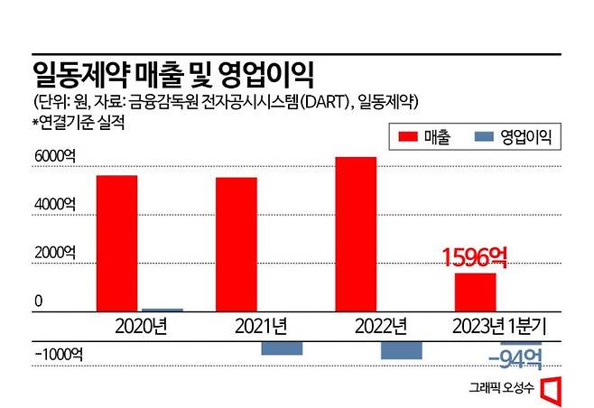 지난해에도 일동제약의 연결기준 영업손실은 735억원으로 2년 연속 영업적자를 기록했다. 전년도와 비교했을 때 적자 폭은 32% 늘었다. 일동제약은 지난해 잠정실적을 발표하면서 영업손실 확대의 배경으로 연구개발비의 증가를 꼽았다. 올해 1분기에도 분기 기준 94억원의 영업손실을 냈다.