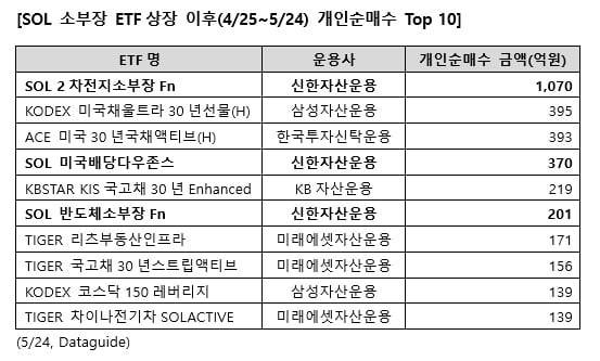 SOL 2차전지 소부장 Fn과 함께 출격한 'SOL 반도체 소부장 Fn'의 개인순매수액도 201억원으로 6위를 기록했다.