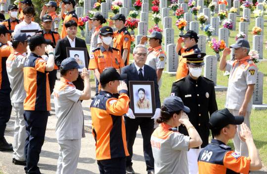 25일 국립대전현충원 소방관묘역에서 거행된 순직소방관 합동안장식에서 유해를 봉송하고 있다. 이번 합동안장식은 지난 3월 '국립묘지 설치 및 운영에 관한 법률'이 개정·시행에 따라 1994년 이전 순직소방관 5위가 안장됐다.