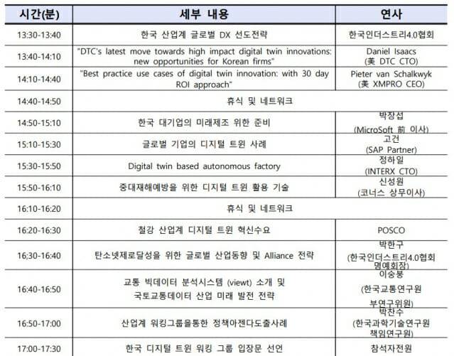 또 '한국 대기업의 미래제조를 위한 준비'를 주제로 박장섭 전 마이크로소프트 이사가 발표하고 SAP파트너가 글로벌 기업의 디지털 트윈 사례도 공개된다. 이외에 정하일 INTERX CTO가 '디지털 트윈 기반 자동 공장'을, 신성원 코너스 상무가 '중대재해예방을 위한 디지털 트윈 활용 기술'을, 포스코에서 '철강 산업계 디지털 트윈 혁신수요'를, 박한구 한국인더스트리4.0협회 명예회장이 '탄소넷제로달성을 위한 글로벌 산업동향 및 얼라이언스 전략'을 주제로 각각 발표한다.