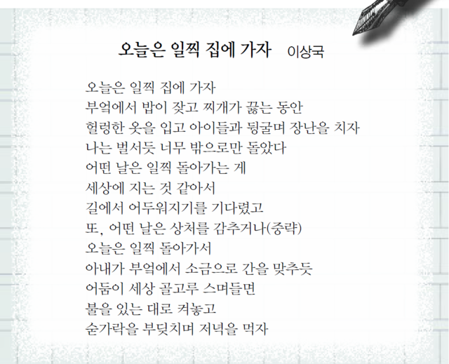 이상국의 시에 나오는 가장은 누구인가. 요즘 막 쏟아져 나오기 시작한 베이비붐 세대 중 하나일 것이다. 고향을 떠나 대처에서 돈을 벌거나 ‘한자리’ 차지해야 성공하는 것이라고 믿었던 세대. 앞만 보고 달려왔는데 막상 은퇴하고 나니 앞이 보이지 않는 젊은 노년들.