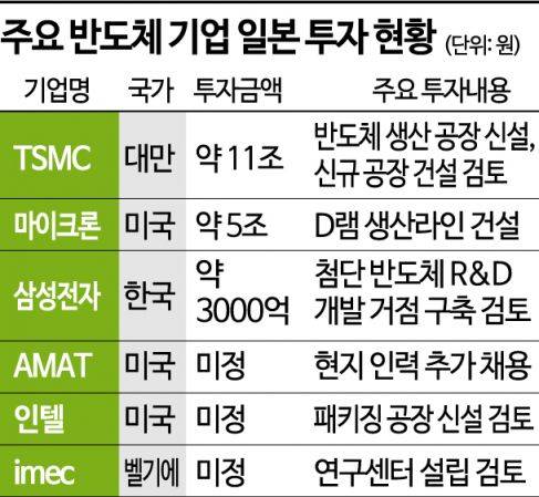 일본은 다른 주요국과 마찬가지로 반도체 투자 유치에 열을 올리고 있다. 세계 1위 반도체 파운드리(위탁생산) 업체 대만 TSMC가 구마모토현과 이바라키현에 반도체 생산과 개발 거점을 짓고 있다. 인텔은 반도체 패키징 공장 투자를 할 가능성을 내놨고 삼성전자는 연구개발(R&D) 전용 반도체 생산라인을, 벨기에 imec는 연구센터를 세운다고 밝혔다.
