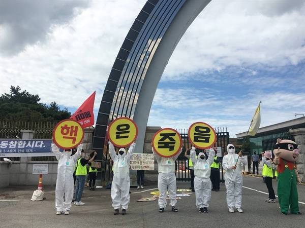 | ▲ 생명평화탈핵순례단이 한빛핵발전소 앞에서 탈핵 퍼포먼스를 하고 있다. |