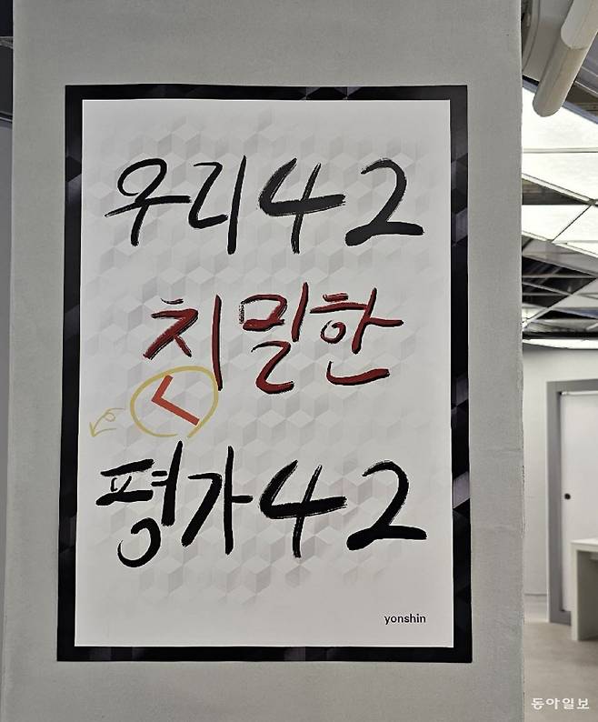 그런데 42서울을 둘러다보니 ‘우리 42(사이) 친밀한 평가 42(사이)’라는 문구가 벽에 걸려 있는 게 눈에 띄었습니다. 프랑스 에꼴42도 그렇지만 42서울에서도 동료들의 평가가 굉장히 중요합니다. 이 교육의 핵심이 자기주도학습과 동료학습이기 때문이죠. 학생들은 한 단계씩 수준이 높아질 때마다 서로 다른 두 명의 동료 학생 평가를 받아야 합니다. 평가 포인트 제도가 있어서 평가를 요청할 때마다 1포인트를 소진하고 다른 학생의 평가를 해 줄때마다 1포인트를 벌게 됩니다. 즉 동료 평가를 도와줘야만 포인트를 쌓을 수 있어 ‘상부상조’가 절실합니다.