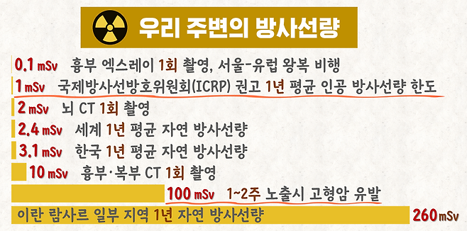 연구 결과가 나왔으니, 이제 '안전 기준'을 정해야 합니다. 하지만, 기준을 1~2주에 100mSv로 정할 수는 없습니다. 100mSv 이하는 안전하다는 것이 아니라, 암과의 관련성이 입증되지 않았을 뿐이기 때문입니다. 특히, 사람들은 늘 자연 방사능을 받고 살아갑니다. 자연 방사선이든 인공 방사선이든 인체에 미치는 영향은 똑같습니다. 한국인이 받는 평균 자연 방사능은 한 해 3.1mSv 입니다. 또, 아프면 치료를 받아야 합니다. 일단 병이 낫는 게 중요하기 때문입니다. 우리 몸은 흉부 CT 한 번 찍을 때 10mSv의 방사선량을 받습니다. 자연 방사능은 우리가 살면서 계속 받아야 할, 조절 불가능한 방사능입니다.