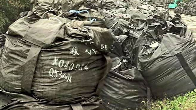 주요 방사성 물질인 세슘은 물에 잘 녹기 때문에, 비가 오면 땅에 스며들게 됩니다. 그렇게 스며든 세슘은 흙에 잘 달라붙습니다. 그런 흙을 모아, 바람에 날려 흩어지는 것을 막기 위해 이렇게 까만 포대 안에 넣어 저장하고 있습니다.