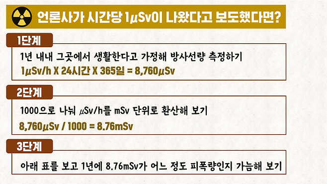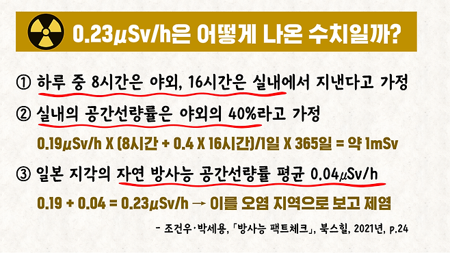 즉, 일본 정부는 '1년'에 '1mSv'라는 수치를 준용해, 시간당 0.23μSv이라는 수치를 도출해 냅니다.