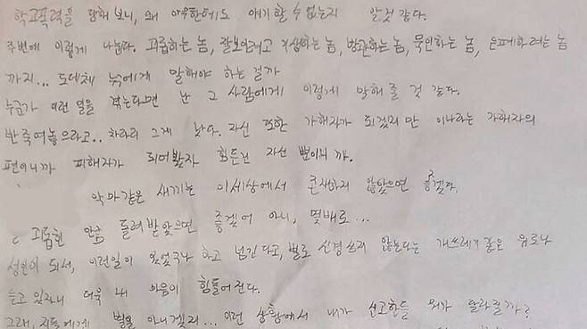 이후 김 군의 가방에서는 작은 수첩이 발견됐는데, 이 안에는 지난 3년간 김 군이 7~8명의 동급생으로부터 학교폭력 피해를 당한 내용이 적혀 있었습니다.