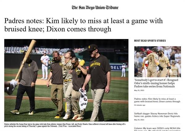 | ▲ 김하성의 부상 소식을 전하는 <샌디에이고 유니언-트리뷴> 갈무리 |