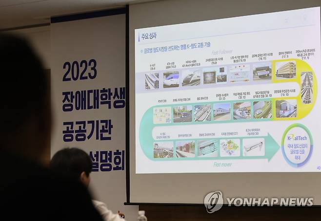 (서울=연합뉴스) 이재희 기자 = 26일 오전 서울 서초구 aT센터에서 열린 '2023 장애대학생 공공기관 채용설명회'에서 참석 학생들이 설명을 듣고 있다. 2023.5.26