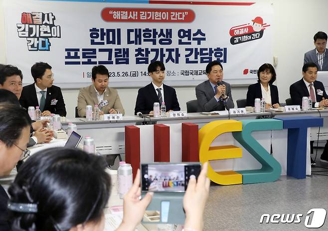 (성남=뉴스1) 황기선 기자 = 김기현 국민의힘 대표가 26일 오후 경기 성남시 분당구 국립국제교육원에서 열린 한미 대학생 연수프로그램(WEST) 참가자 간담회에서 인사말을 하고 있다. 2023.5.26/뉴스1