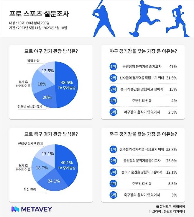 데이터 기반 리서치 기업 메타서베이(MetaSurvey)가 신개념 설문조사 서비스 메타베이를 통해 5월 11일부터 5월 18일까지 10~60대 남녀 200명을 대상으로 흥행 가도를 달리고 있는 프로스포츠와 관련한 설문조사를 진행했다.