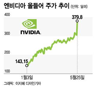 반도체회사 엔비디아가 AI(인공지능) 열풍에 따라 25일(현지시간) 하루만에 주가가 24.4% 급등했다. 엔비디아는 올들어 159.9% 폭등했다.